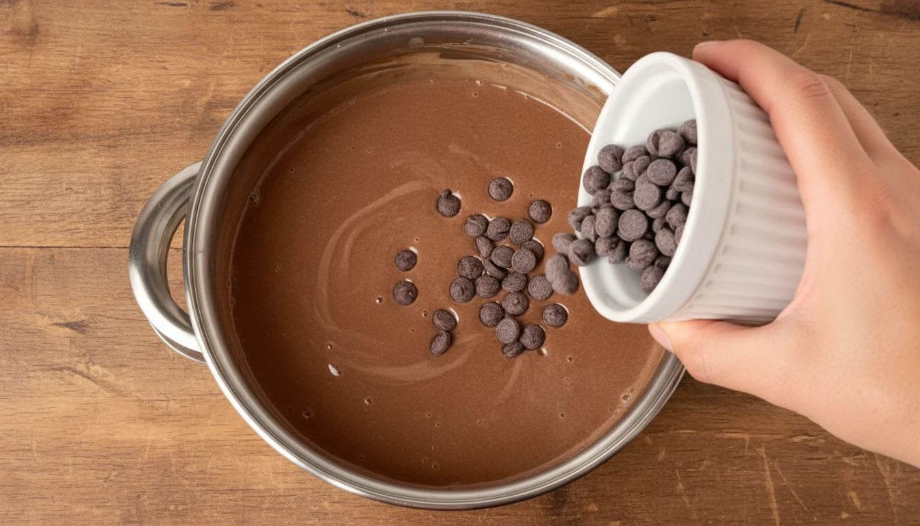 - Após esse tempo, adicione o chocolate amargo e cozinhe por mais 30 segundos, mexendo sempre. Depois, desligue o fogo e mexa por mais 2 minutos ou até que o chocolate esteja completamente derretido;