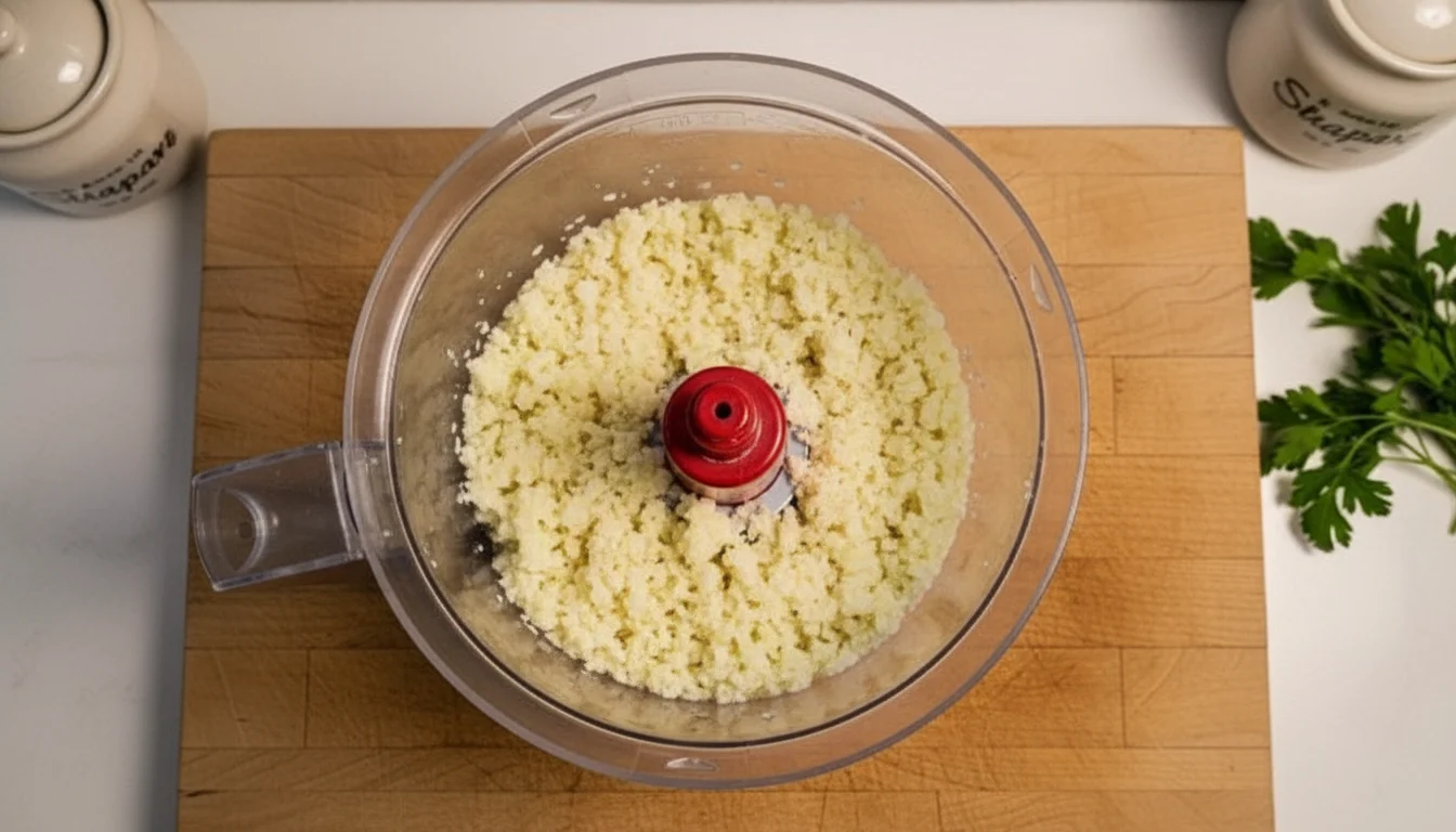 - Coloque a couve-flor cozida em um processador e processe com cuidado, para que não se transforme em purê. Pequenos pedaços ajudam a manter a textura que buscamos;