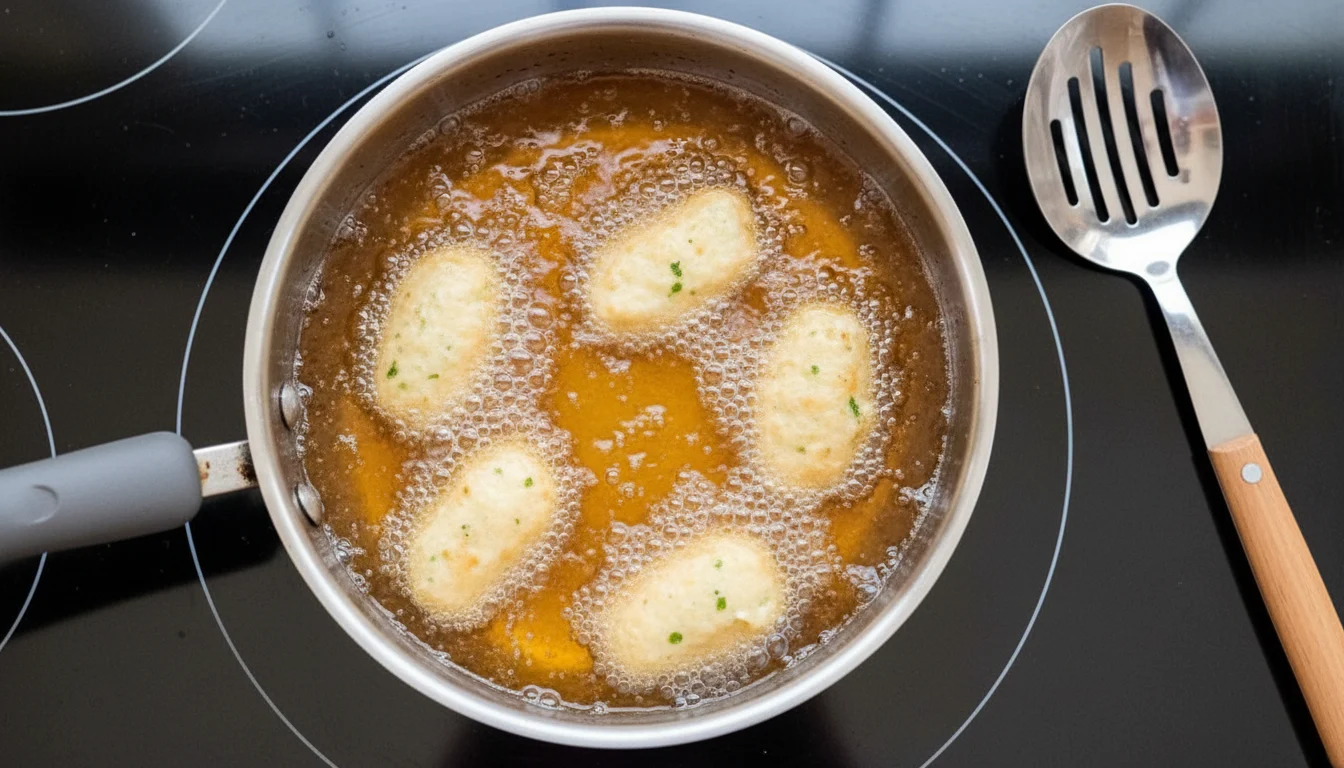 - Utilizando uma colher, molde a massa em formas ovais. Com cuidado, coloque os bolinhos no óleo quente e frite;