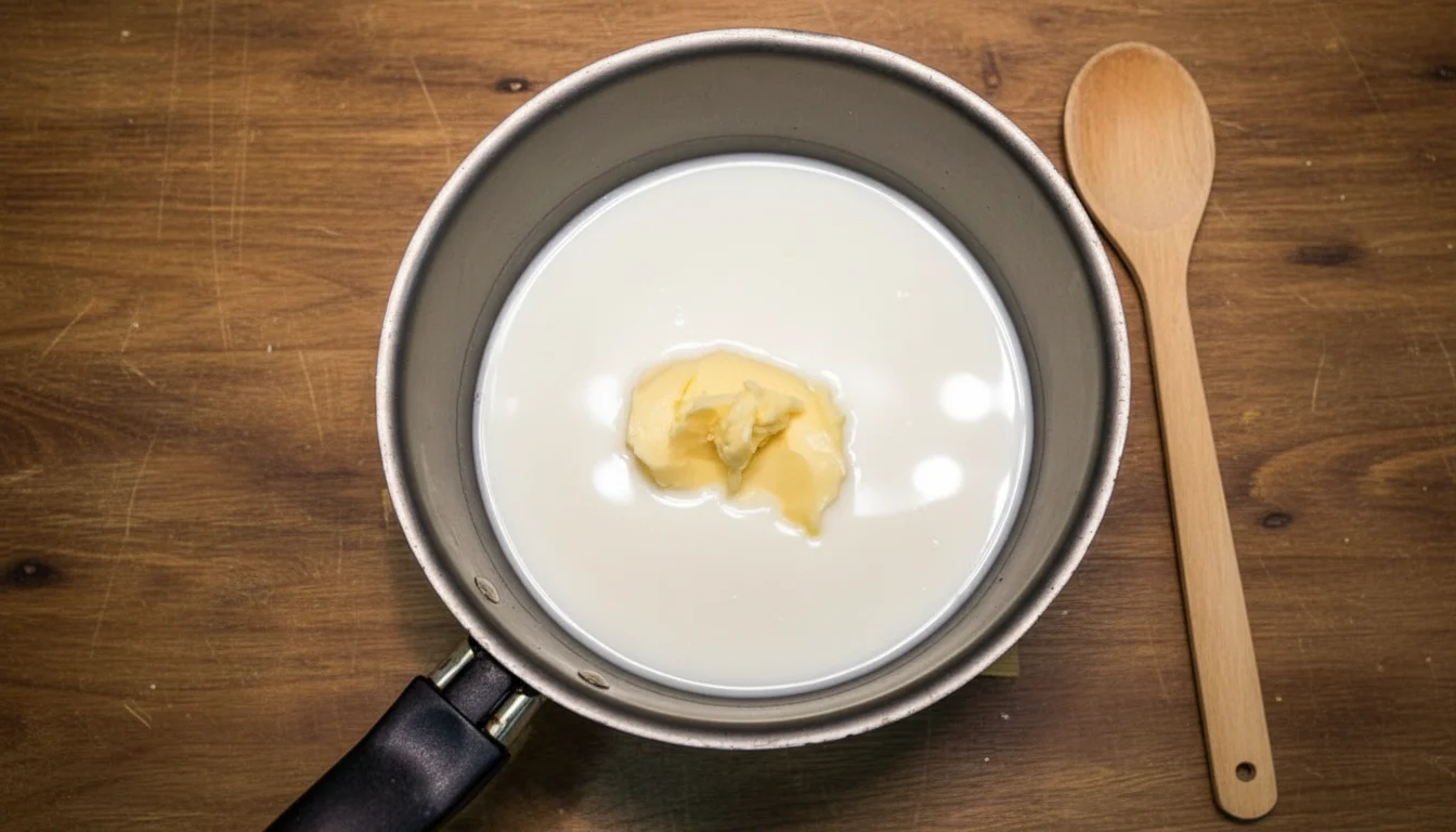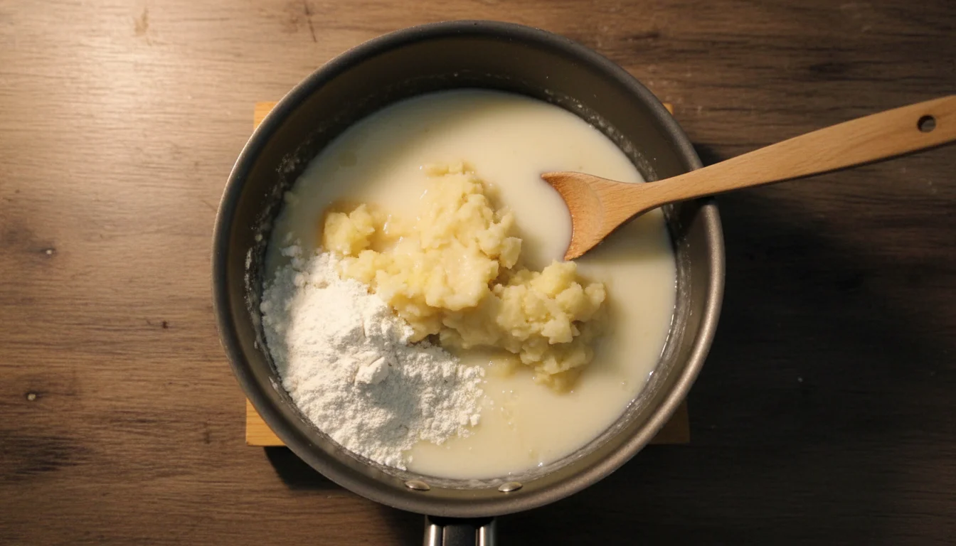 - Em uma panela, adicione a água, o leite, o açúcar, o sal e a manteiga. Aqueça até ferver e retire do fogo;