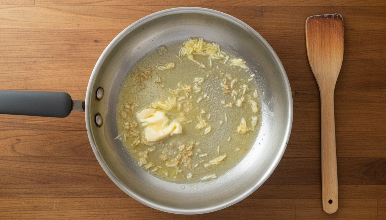- Em uma frigideira aquecida em fogo médio por 1 minuto, adicione a manteiga junto com um fio de óleo. Quando a manteiga derreter, adicione o alho e mexa por 20 segundos para soltar o aroma;