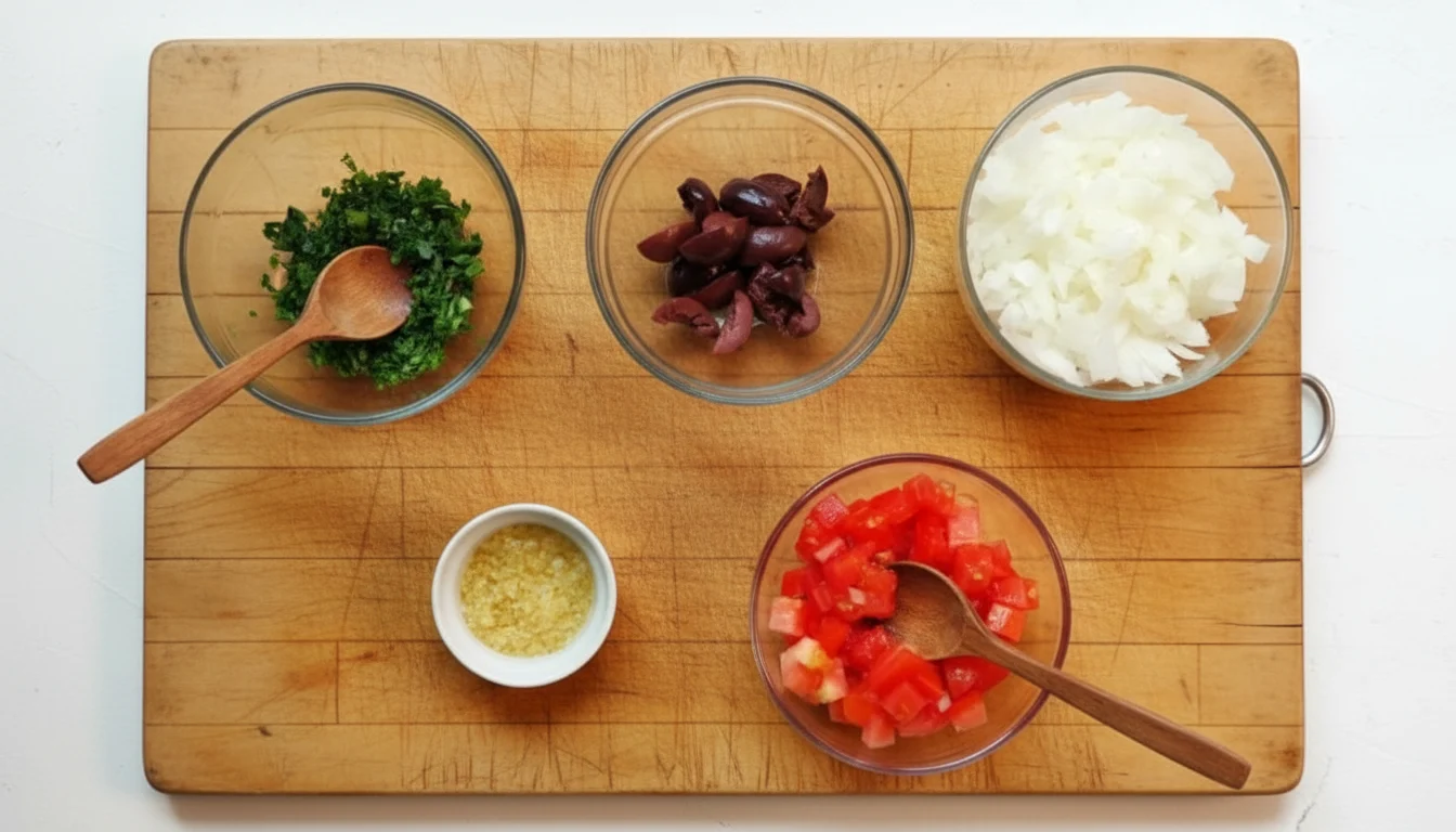 - Descasque e corte a cebola e o alho em pedaços pequenos. Fatie as azeitonas em rodelas. Lave e corte o tomate em cubos pequenos. Lave as folhas de cheiro-verde e pique-as bem.