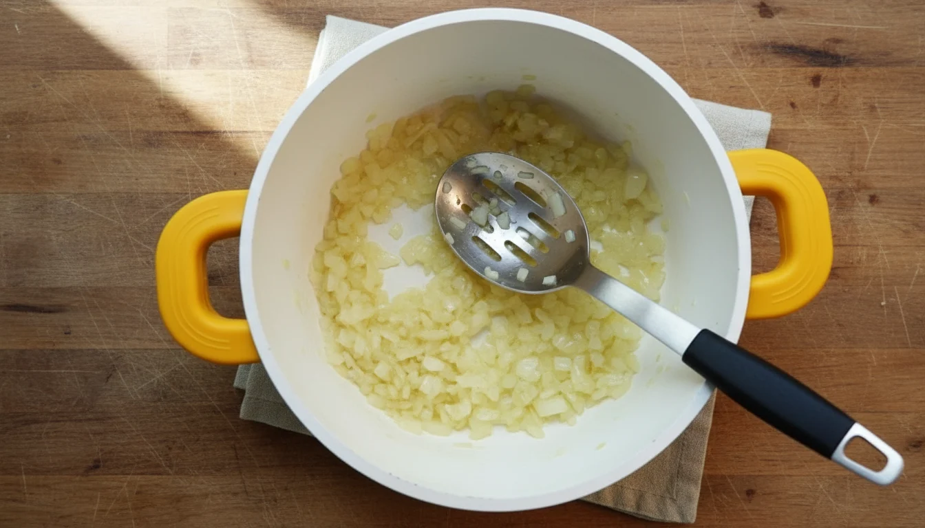 - Em uma panela média, coloque o azeite e aqueça. Adicione a cebola com uma pitada de sal e refogue até que ela fique macia. Em seguida, acrescente o alho picado, misture e refogue por mais 2 minutos, até que comece a dourar.