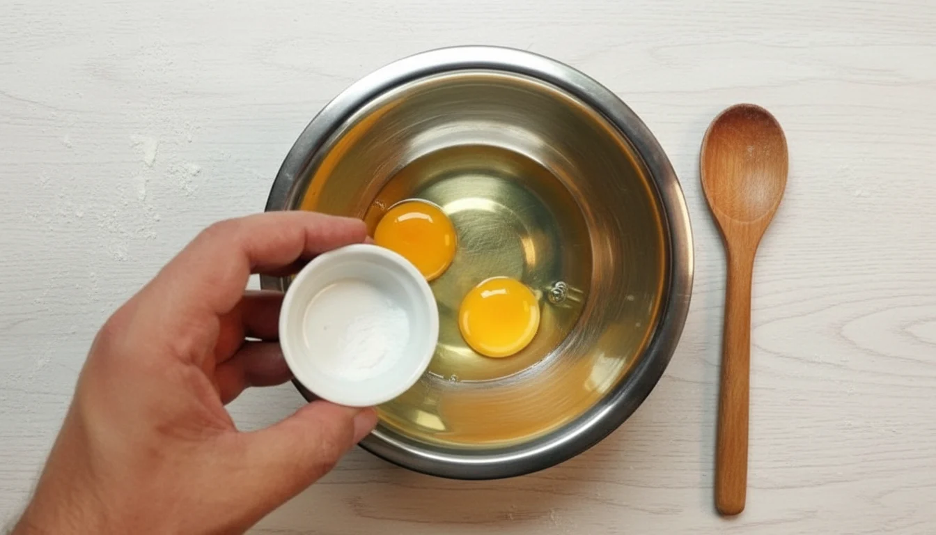 - Para preparar a massa, quebre os ovos em um recipiente pequeno, um de cada vez, e coloque em uma tigela média. Com um batedor ou um garfo, bata os ovos por 1 minuto e adicione sal a gosto.