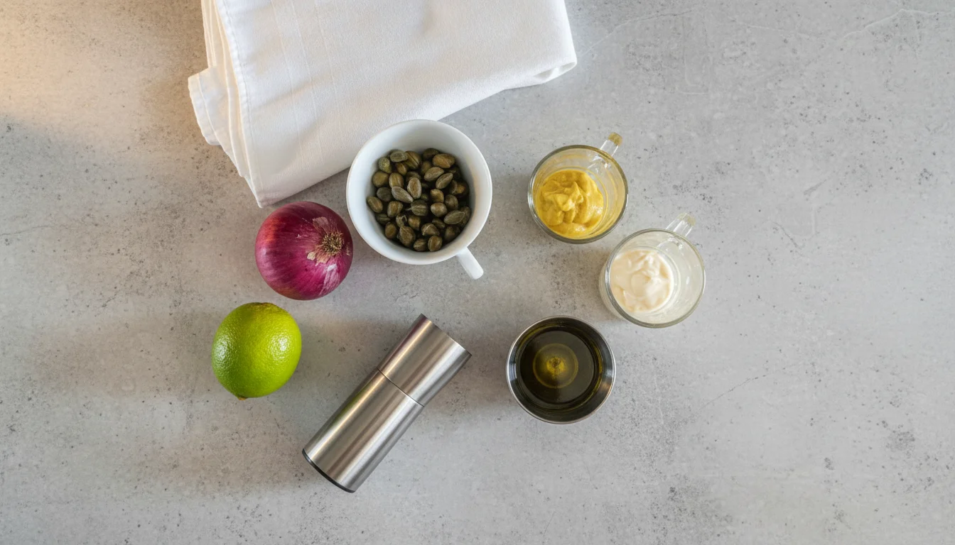 1. Junte todos os ingredientes necessários para o molho do carpaccio;