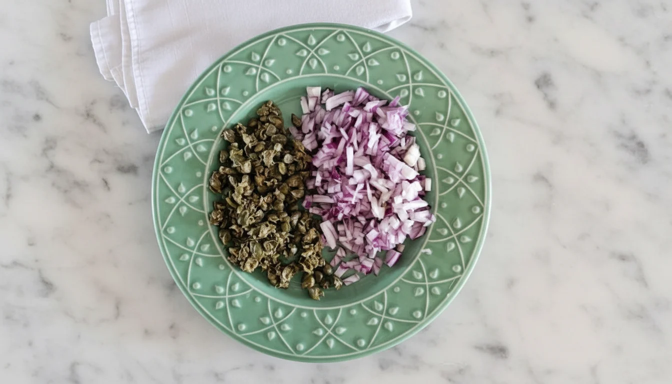 2. Pique as alcaparras e a cebola roxa separadamente;