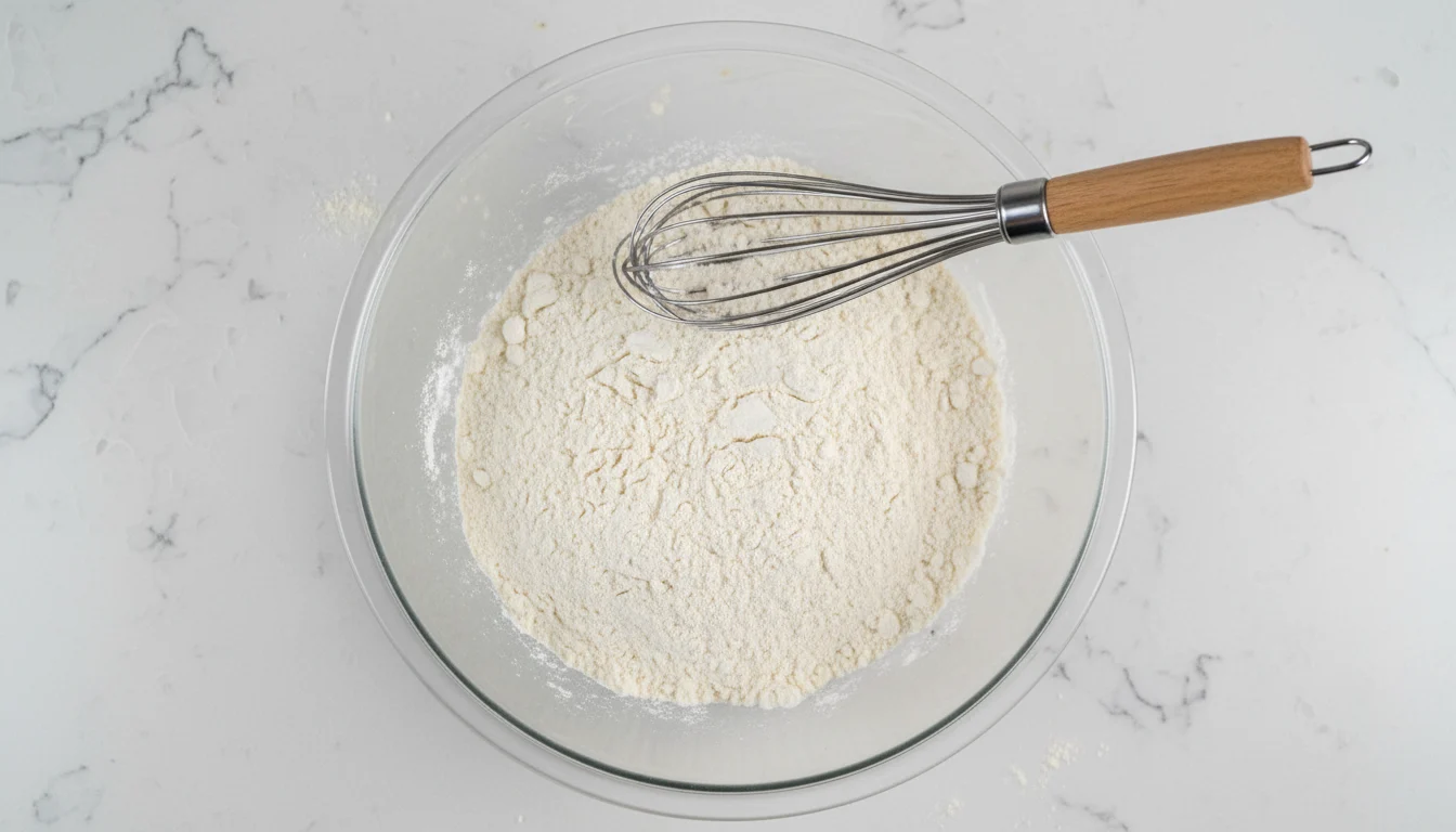 - Em uma tigela, adicione a farinha de trigo, o açúcar, o sal e o fermento biológico, misturando bem com uma colher para que os ingredientes se integrem.
