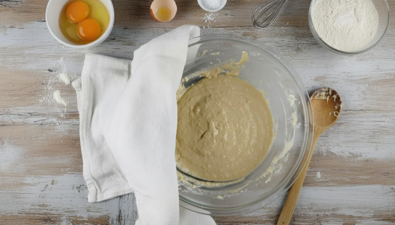 - Em seguida, combine a mistura do liquidificador com os ingredientes secos na tigela, mexendo até obter uma massa homogênea e com consistência líquida. Cubra a tigela com um pano limpo e deixe descansar por cerca de 30 minutos dentro do forno desligado.