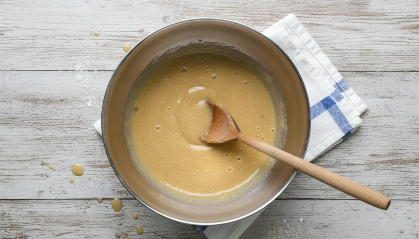 - Incorpore o leite, o mel, e os ovos levemente batidos, mexendo bem até obter uma massa homogênea;