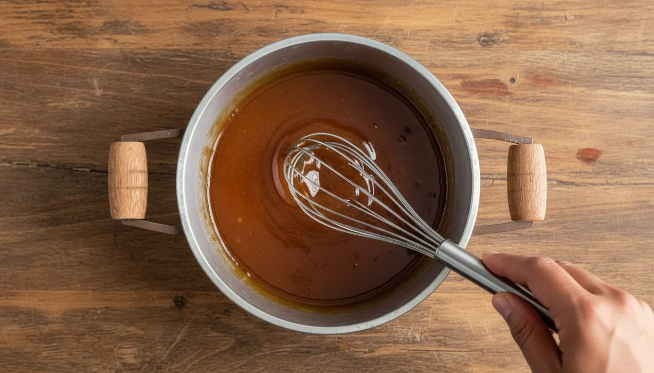 - Em uma panela ampla, coloque o açúcar junto com a água. Acenda o fogo em temperatura alta e mexa constantemente até que tudo esteja completamente dissolvido e se transforme em um caramelo;