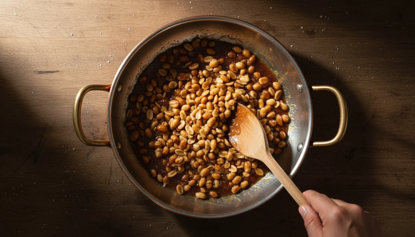 - Assim que começar a borbulhar, desligue o fogo e adicione o amendoim. Misture bem para que tudo fique homogêneo;