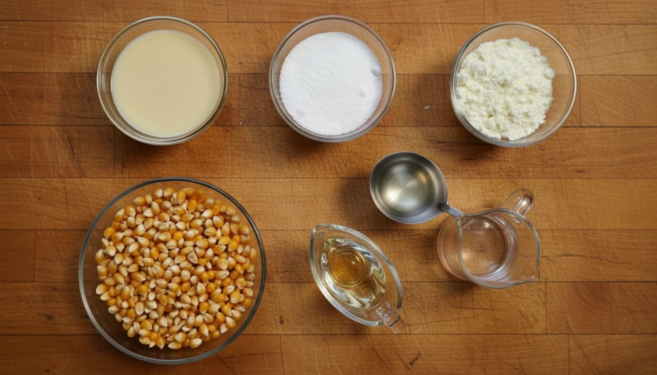 - Reúna todos os ingredientes necessários para preparar a pipoca de leite Ninho com leite condensado.