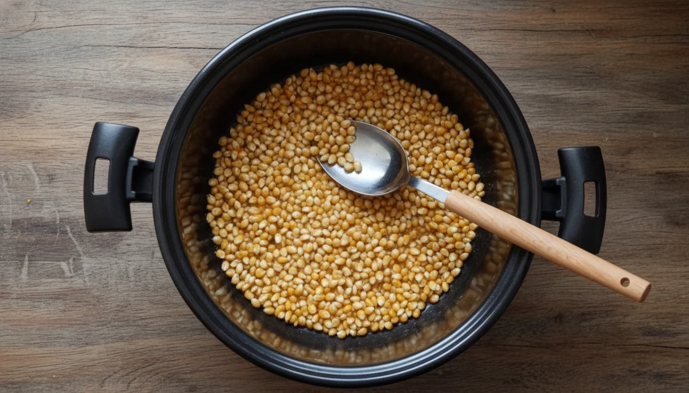 - Distribua o leite condensado por toda a pipoca estourada.
