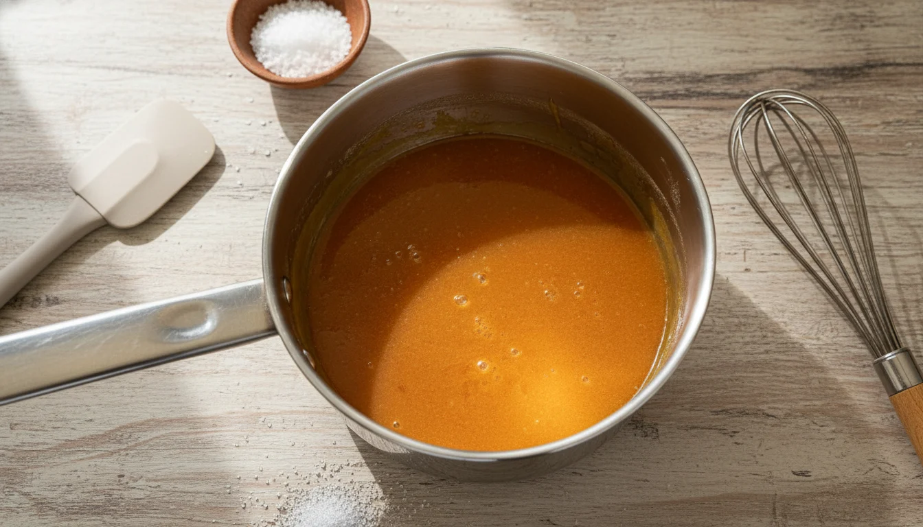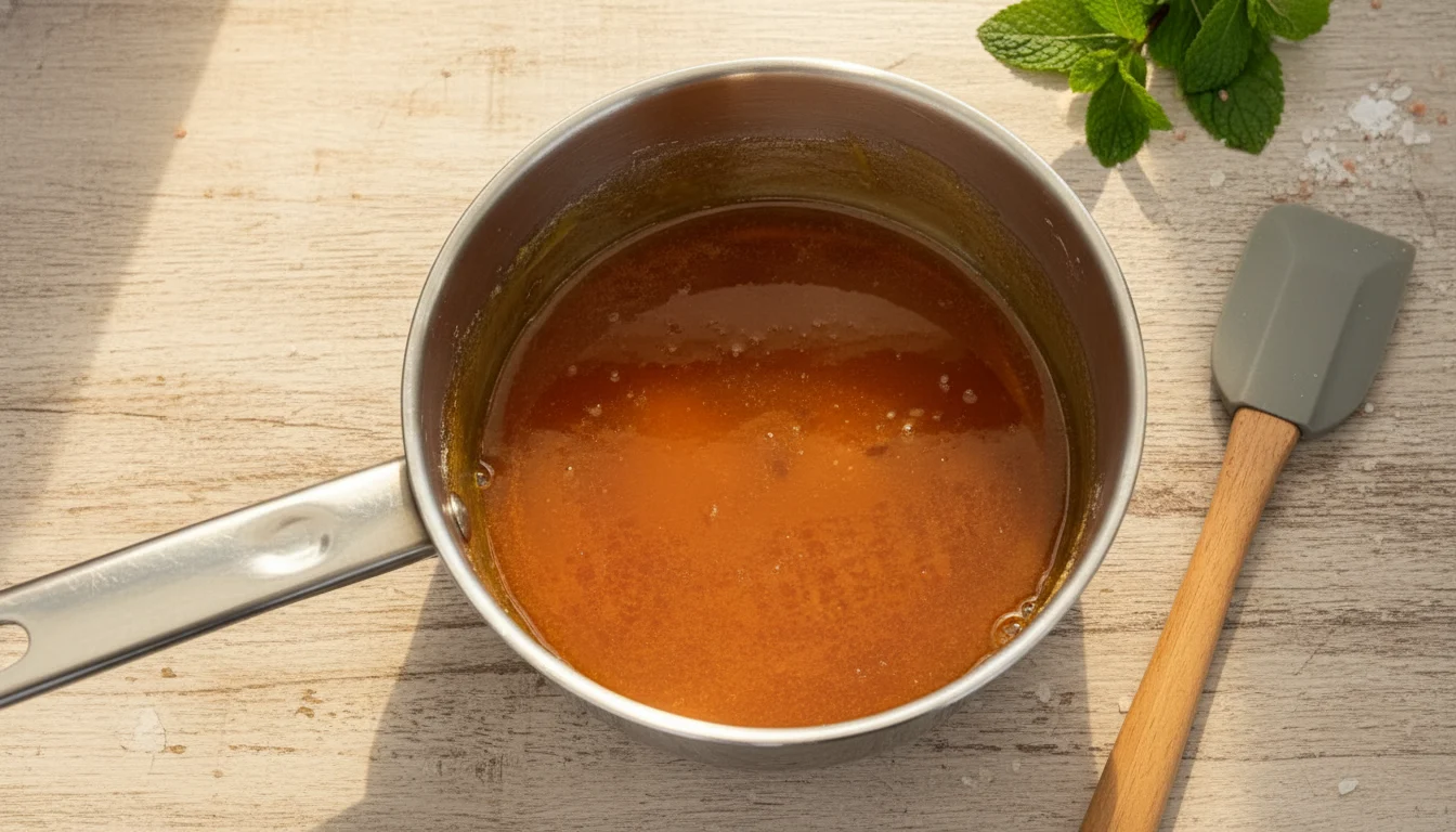 - Com cuidado, adicione a água quente na panela e misture bem para dissolver os cristais de açúcar que sobraram ou até que se forme uma calda em ponto de xarope.