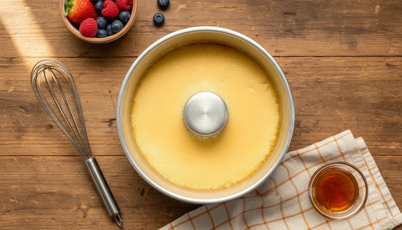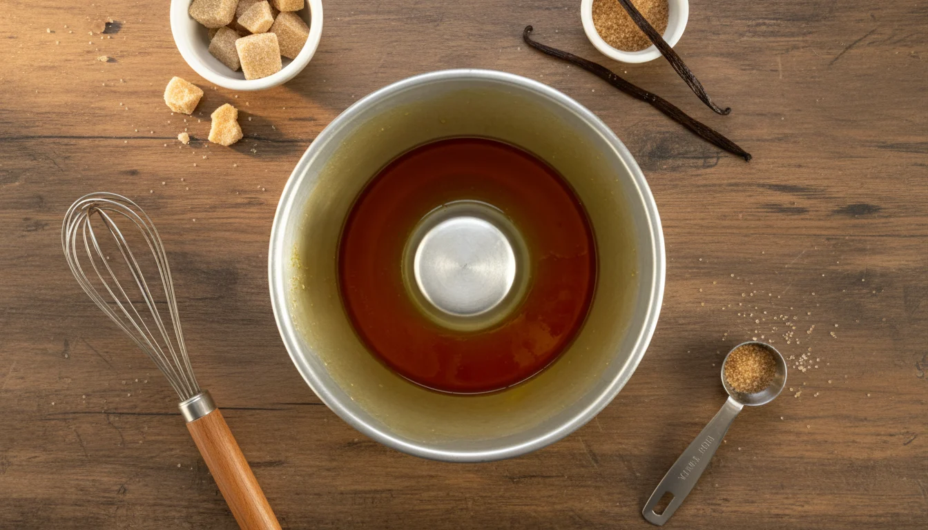 - Transfira a calda para uma forma de pudim com 19 cm de diâmetro, espalhando para cobrir todo o fundo e as laterais. Reserve enquanto prepara o pudim.