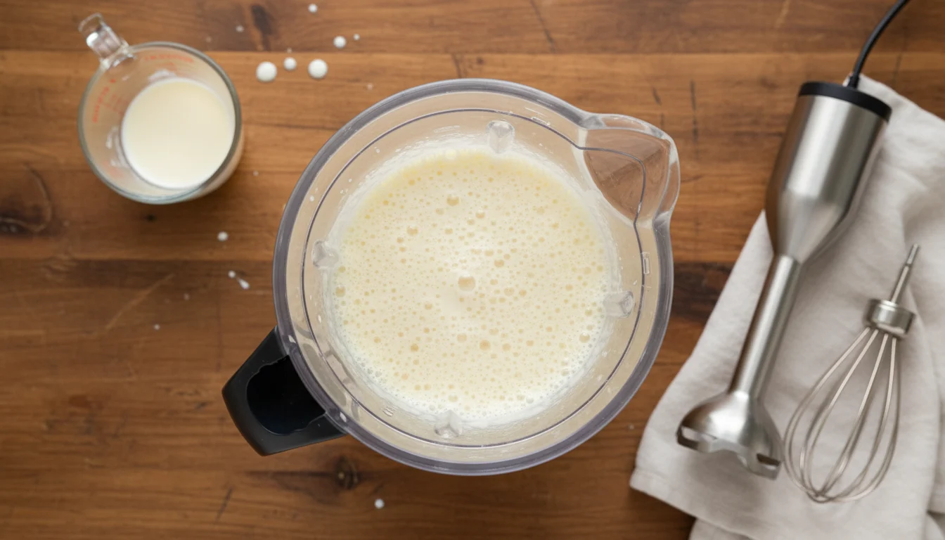 - Quebre os ovos um a um em um recipiente separado e, se estiverem bons, coloque-os no liquidificador. Adicione o leite e o leite condensado, batendo por cerca de 1 minuto até obter uma mistura homogênea.