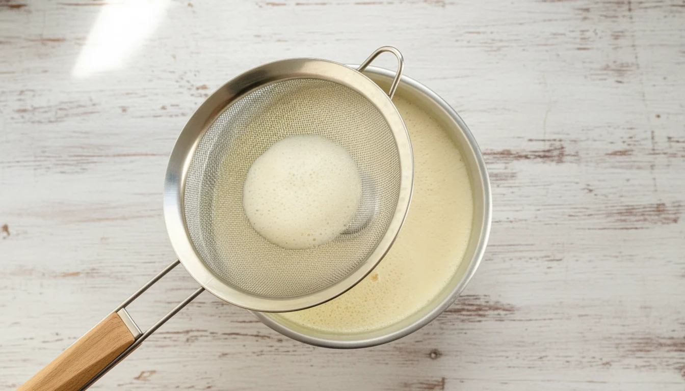 - Coloque uma peneira sobre a forma com a calda e despeje a mistura do pudim. Isso ajuda a eliminar bolhas e pedaços que não foram bem misturados, deixando a textura mais lisa.