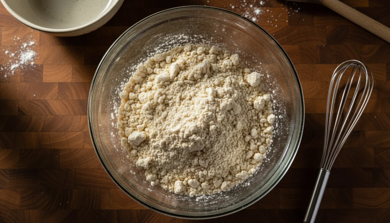 - Em uma tigela, misture a farinha, o sal, o fermento e a manteiga. Utilize as pontas dos dedos para amassar suavemente até obter uma farofa úmida.