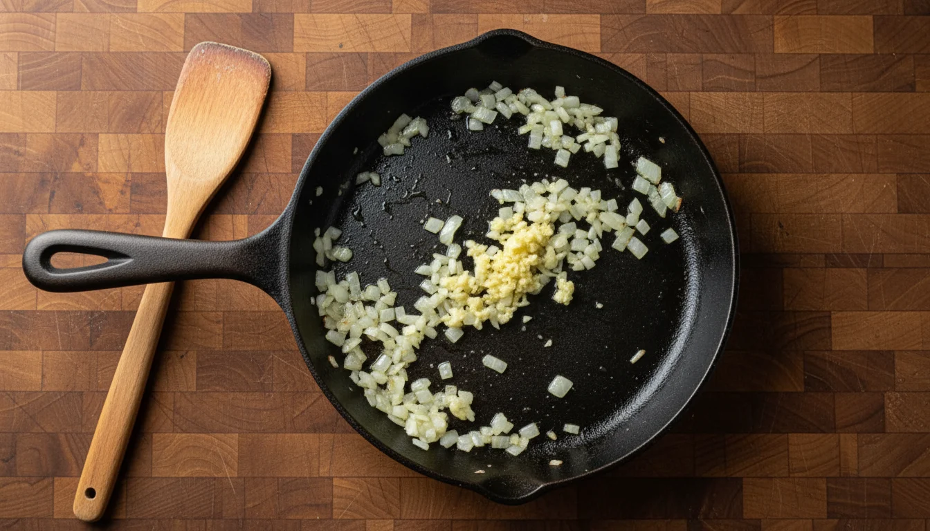 - Agora, vamos preparar o recheio! Aqueça uma frigideira em fogo médio com 2 colheres de azeite, adicione o alho e a cebola até dourar. Reserve 1 colher de sopa deste refogado para a cobertura.