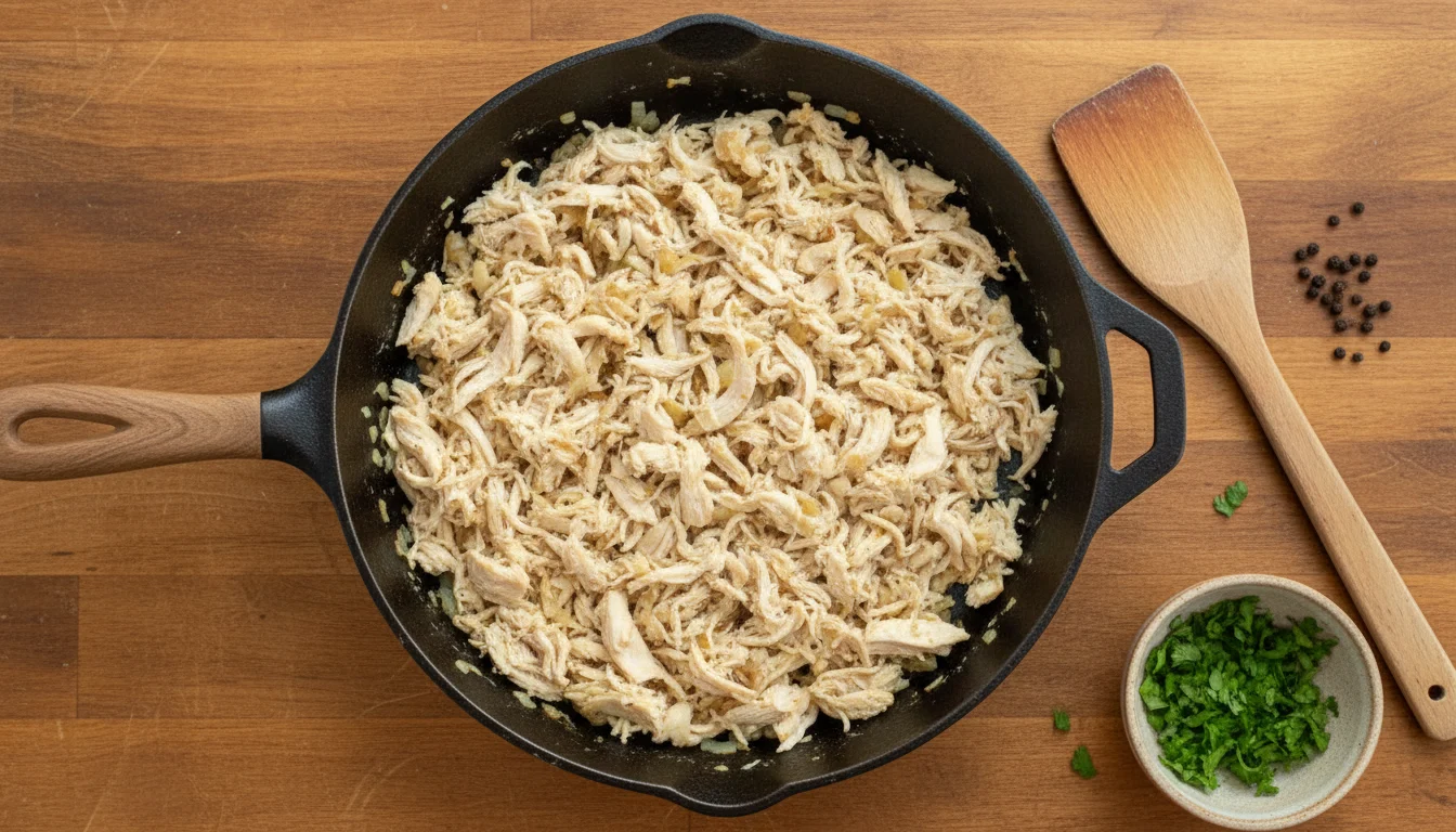 - Adicione o frango desfiado à frigideira e tempere com sal e pimenta-do-reino. Refogue por cerca de 2 minutos, misturando bem, depois desligue e reserve.