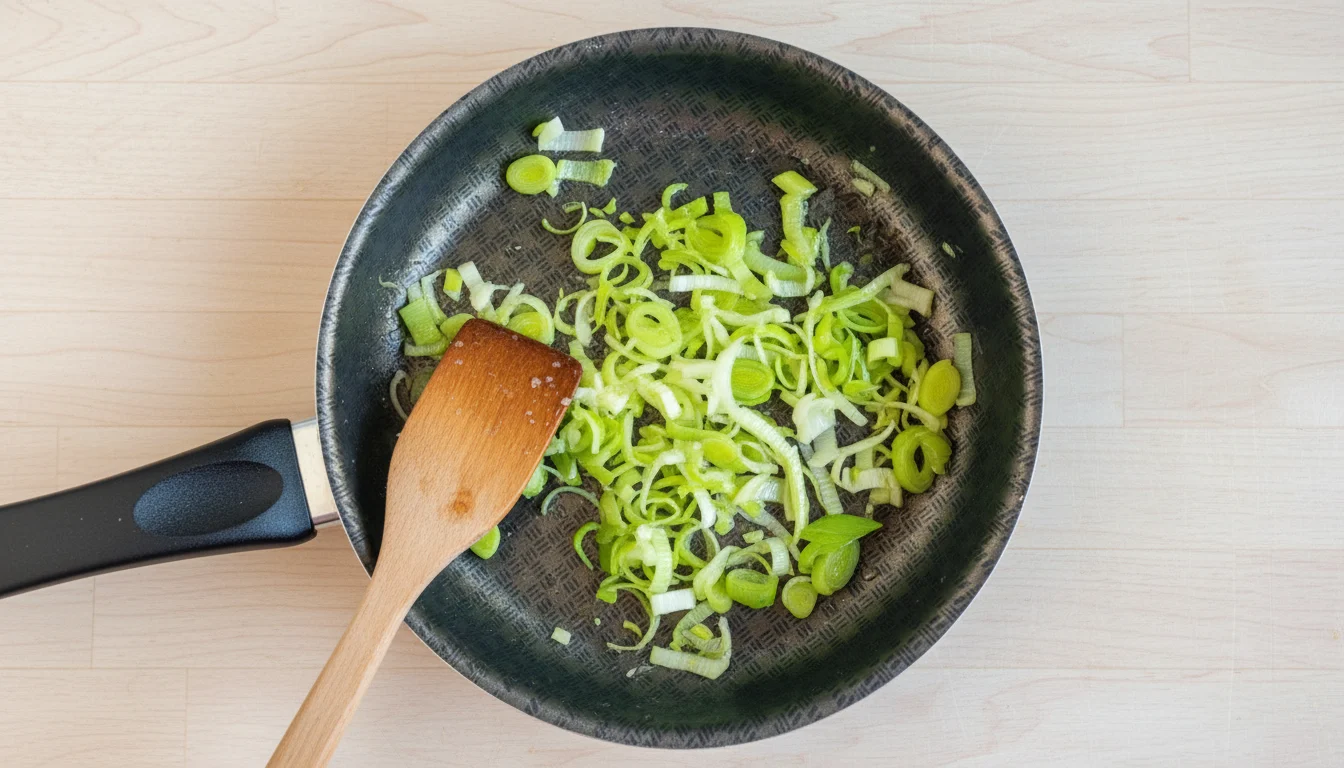 - Em outra frigideira, aqueça o restante do azeite e refogue o alho-poró. Mexa ocasionalmente até que murche e comece a dourar levemente. Tempere com sal e pimenta a gosto.