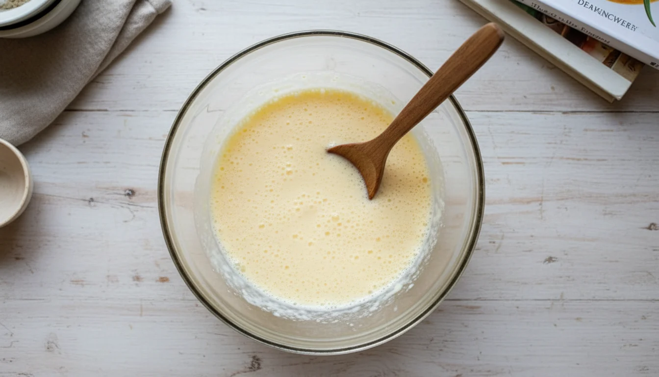 - Em uma tigela, utilizando um batedor, misture os ovos, o creme de leite e o requeijão. Bata até ficar bem homogêneo.