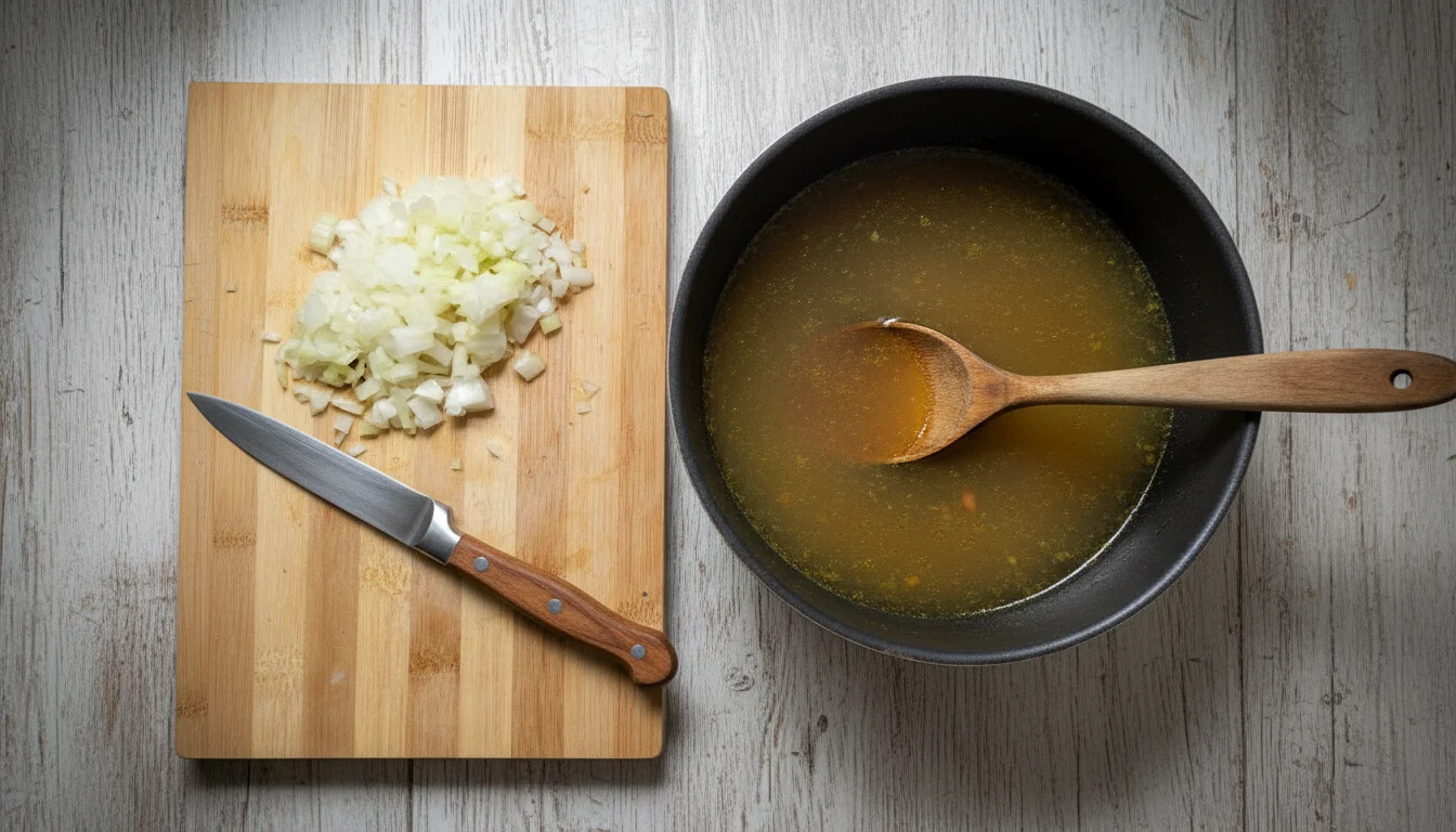 - Descasque e corte a cebola em pequenos cubos. Enquanto isso, aqueça o caldo de legumes caseiro em uma panela ao lado de uma panela grande no fogo alto.