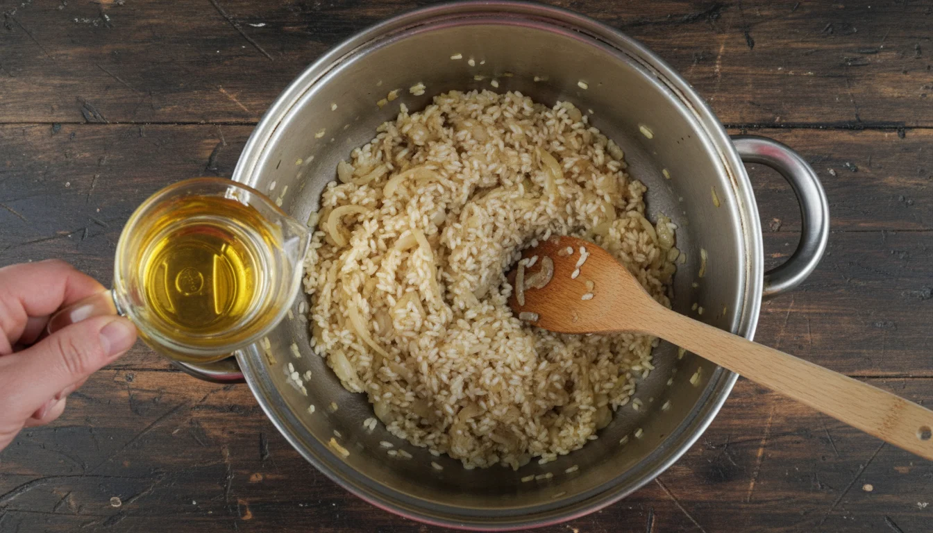 - Adicione mais azeite e continue mexendo. Em seguida, despeje o vinho e aguarde sua evaporação.