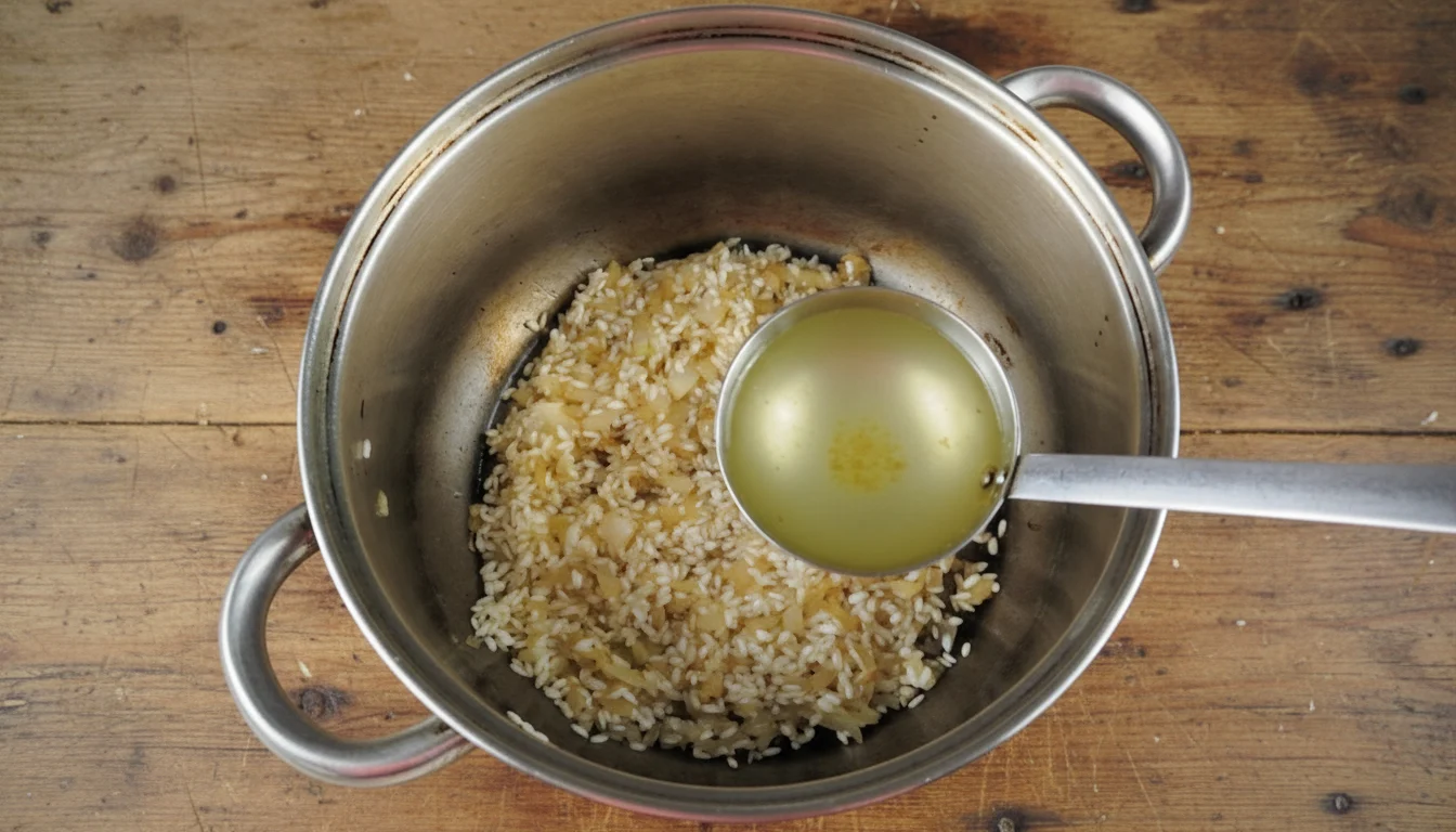 - Adicione uma concha do caldo de legumes e misture vigorosamente até que ele evapore um pouco. Repita esse processo até que o arroz fique quase al dente e desligue o fogo quando estiver quase no ponto, permitindo que termine de cozinhar com o calor residual da panela.