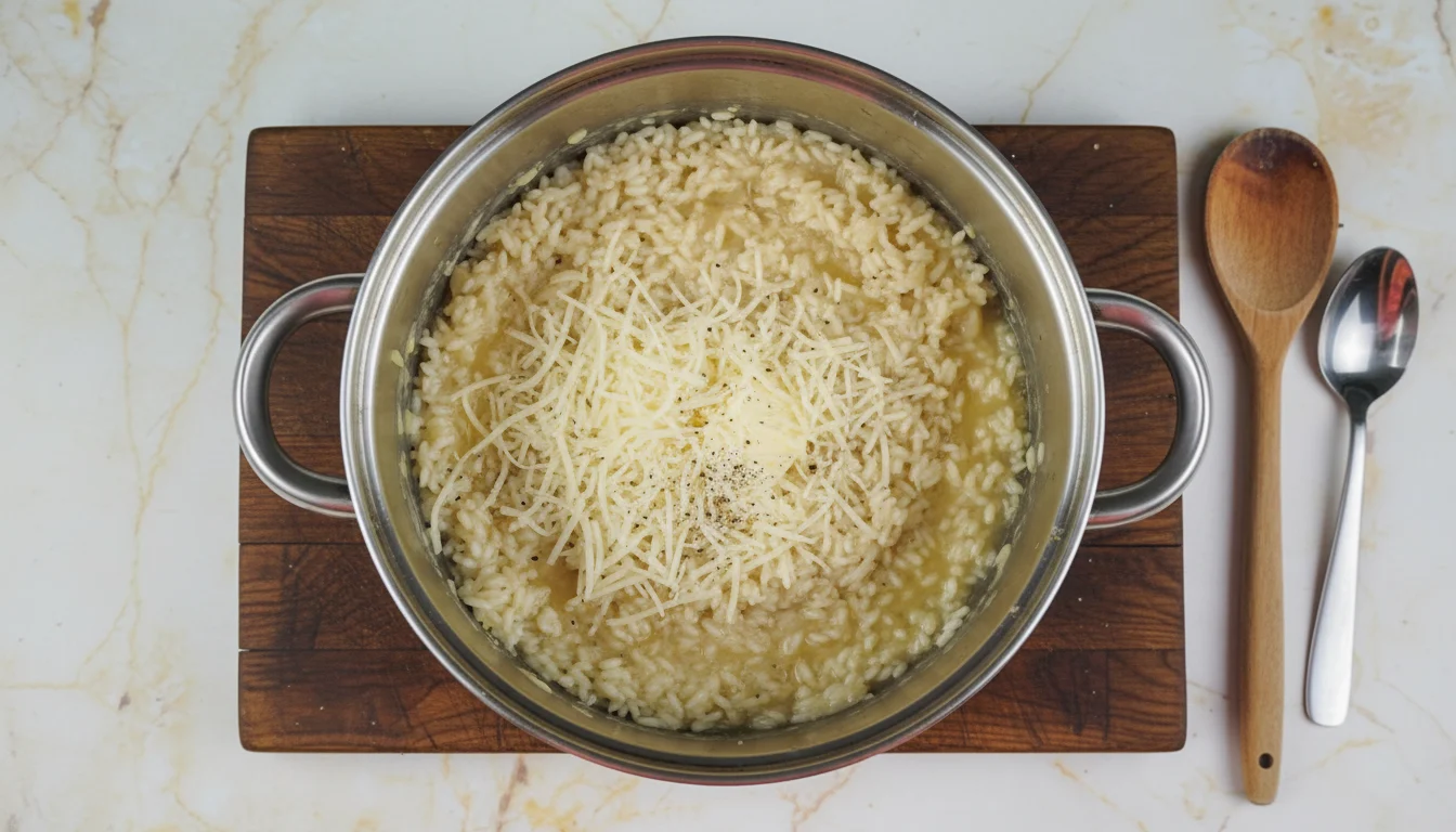 - Incorpore o parmesão ralado e mexa. Adicione mais caldo, tempere com sal e pimenta-do-reino, e finalize com a manteiga.