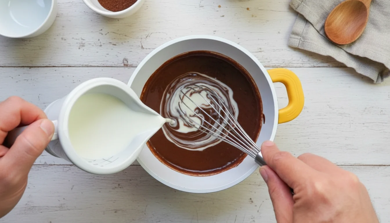 - Enquanto isso, despeje o leite com uma mão e continue a mexer com a outra mão;
