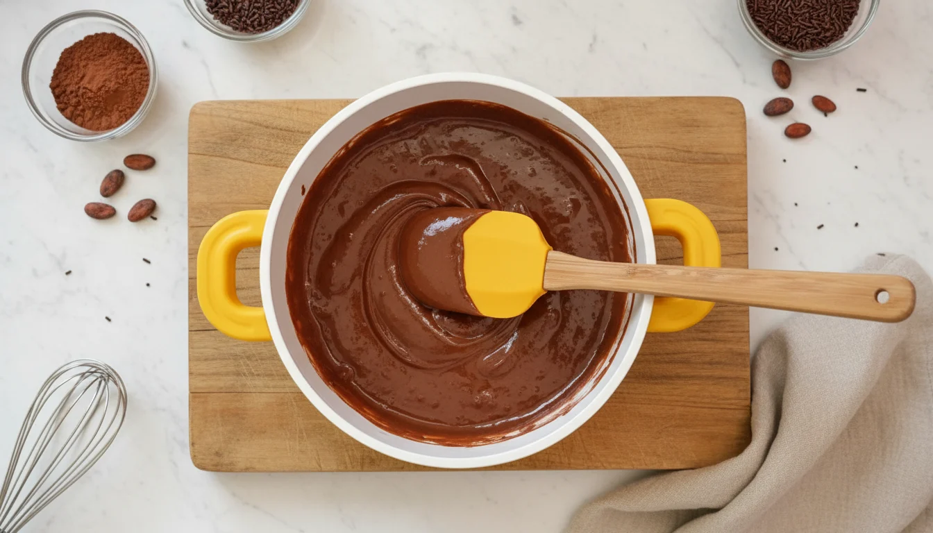- Em uma panela média, adicione o creme de leite e o chocolate em pó. Utilize um batedor para misturar até obter uma mistura homogênea e bem dissolvida;
