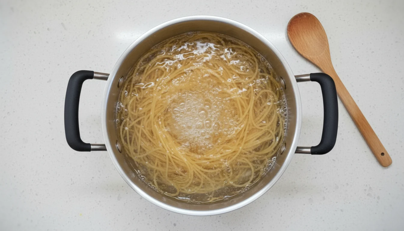 - Assim que a água estiver fervendo, adicione o sal e o espaguete. Cozinhe até que fique al dente, aproximadamente 5 a 10 minutos, mexendo ocasionalmente para evitar que grude.