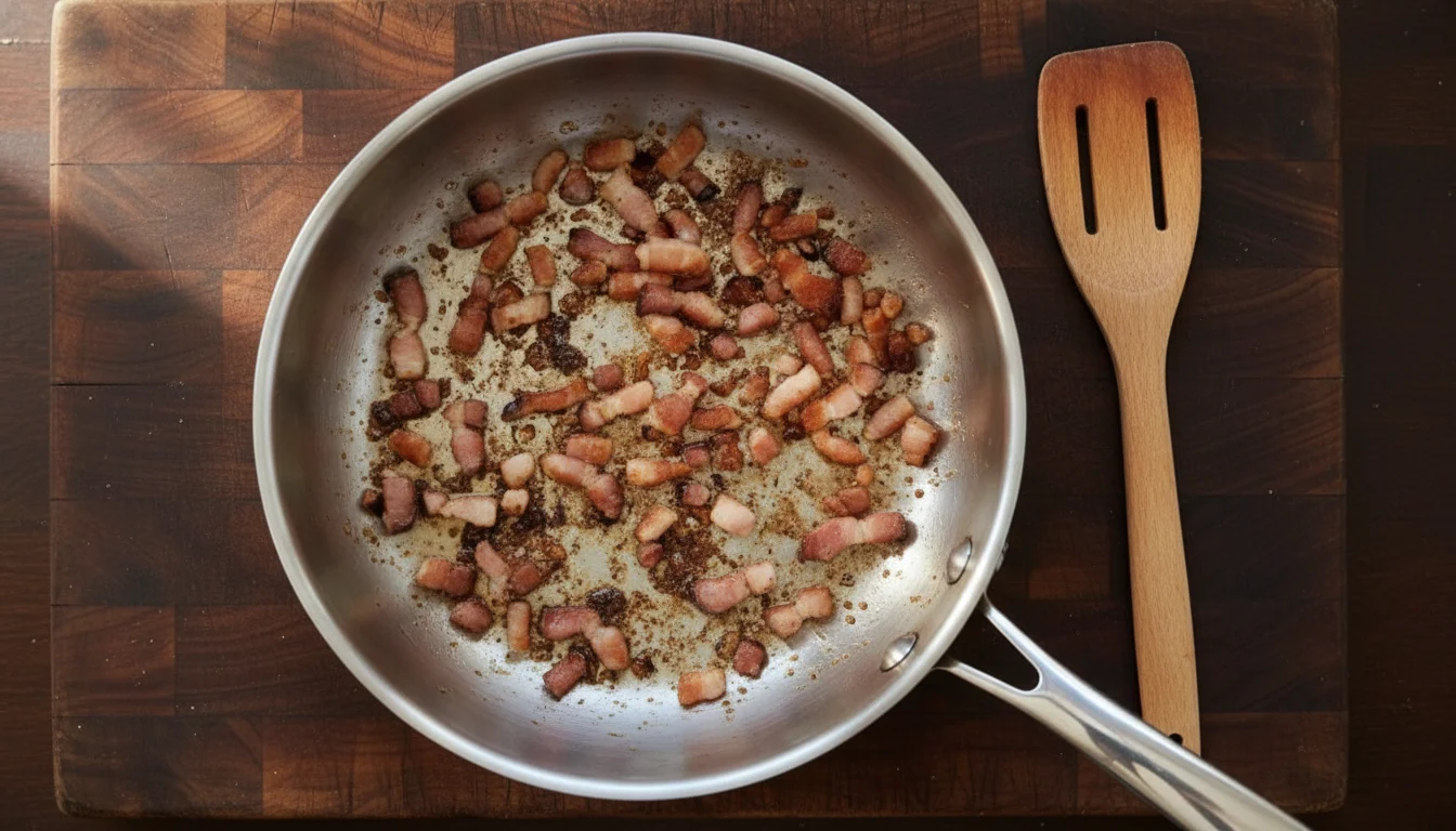 - Em uma frigideira grande, em fogo médio-baixo, frite o bacon até que esteja bem dourado e solte sua gordura.