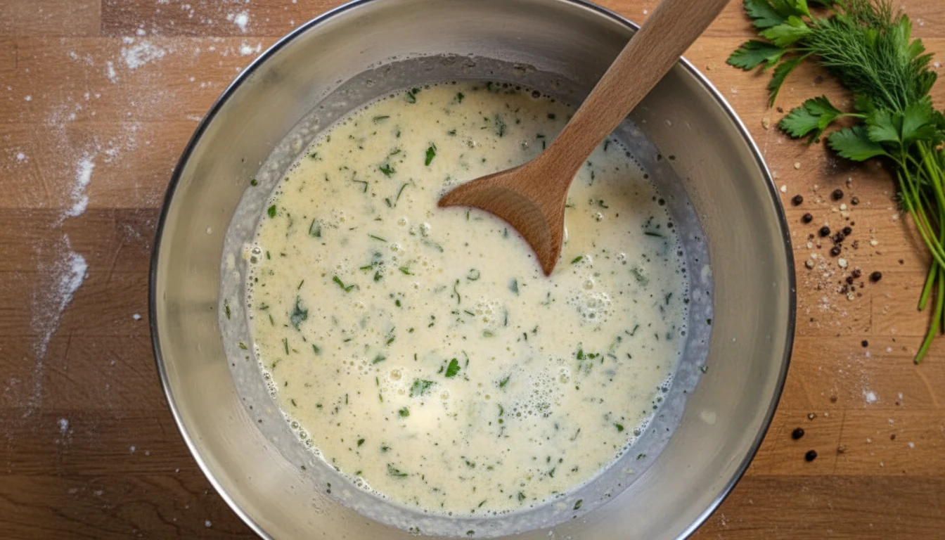 - Quebre os ovos em uma tigela pequena e, se estiverem bons, coloque-os em uma tigela maior. Bate os ovos com um batedor por 1 minuto. Em seguida, adicione o queijo ralado, o cheiro-verde e o creme de leite, misturando bem.