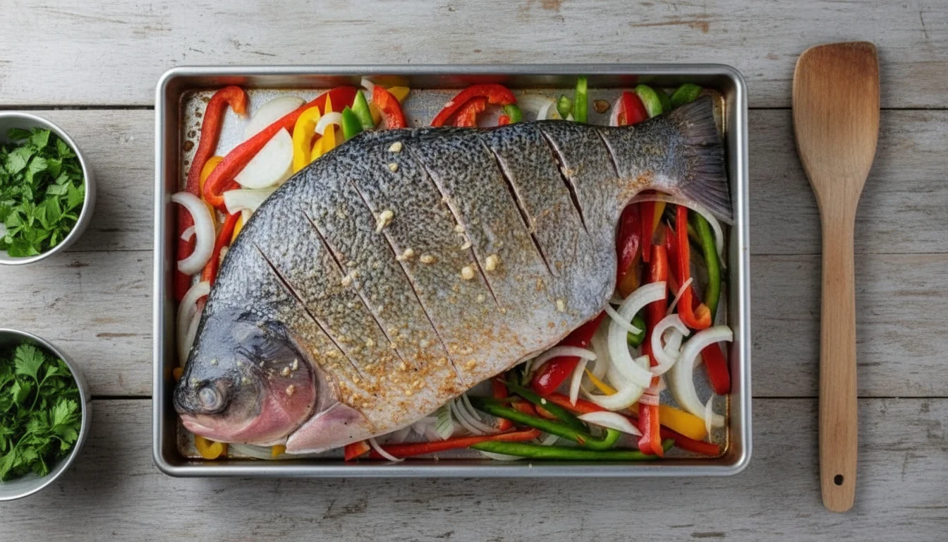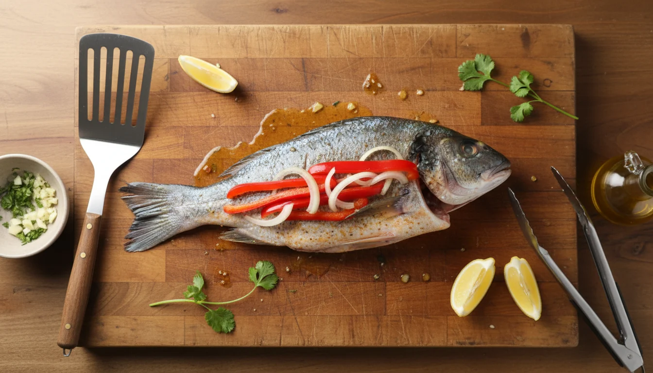 - Dentro do peixe, adicione metade da cebola e dos pimentões. Sinta-se à vontade para incluir outros ingredientes que desejar.