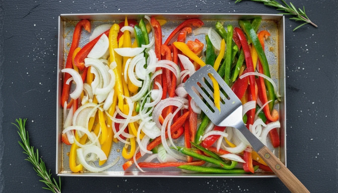 - Em outra assadeira, coloque um pouco de azeite e espalhe. Em seguida, adicione uma camada de cebola e pimentões.