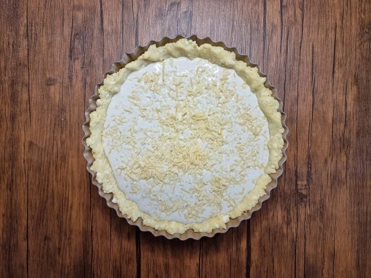 - Depois que a massa esfriar completamente, despeje o recheio e polvilhe queijo parmesão ralado por cima.