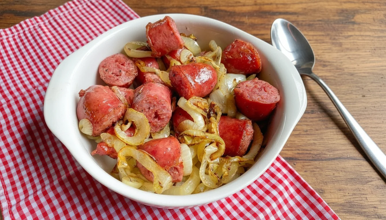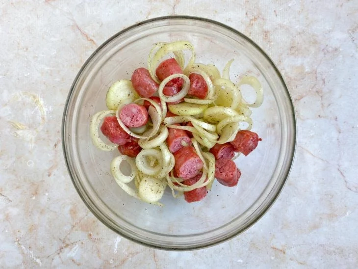 - Saque a linguiça da air fryer e divida cada gomo em 3 partes iguais. Adicione à tigela com as cebolas e misture novamente.