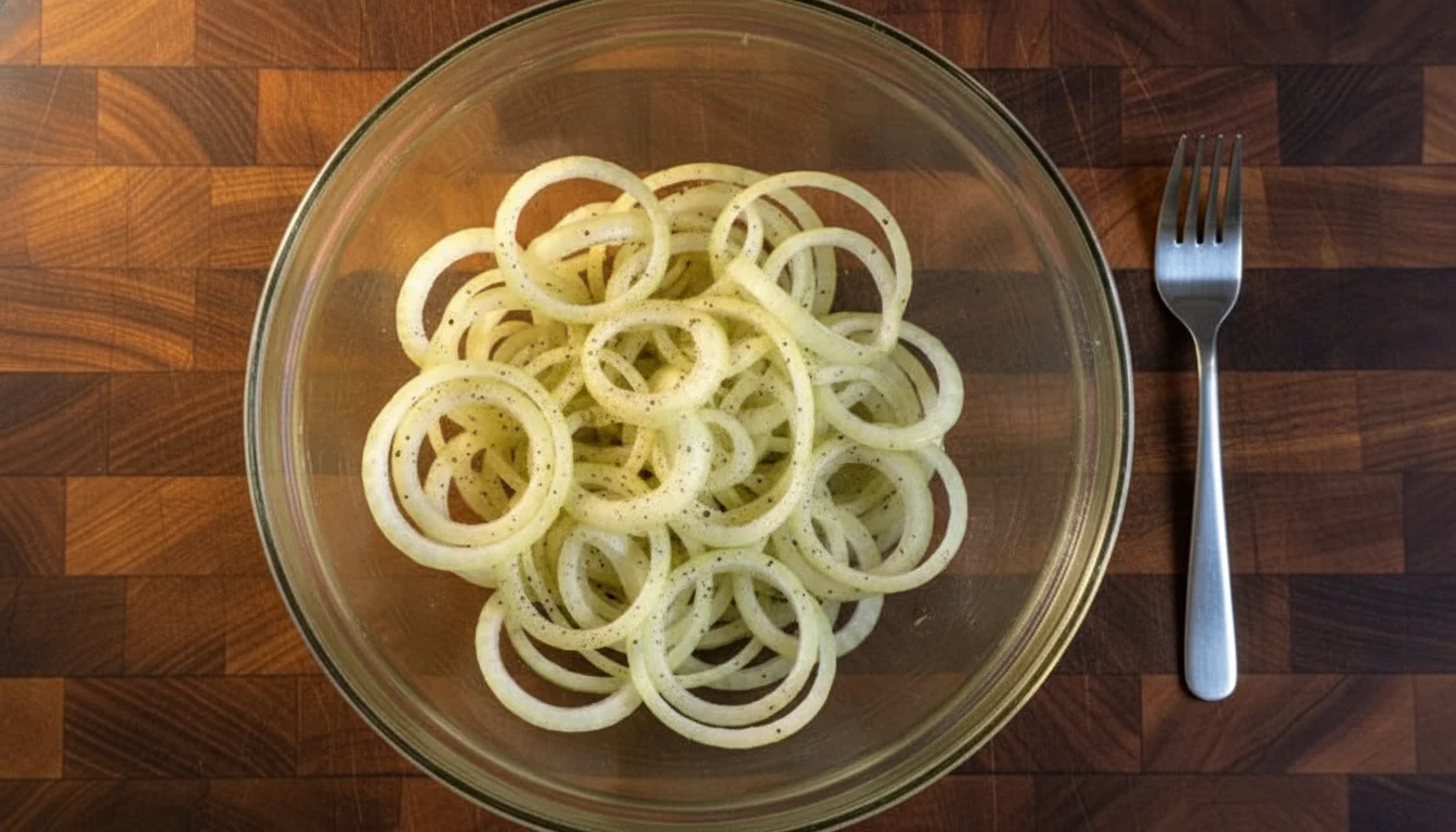 - Em um recipiente médio, junte as cebolas, o azeite, o sal, a pimenta-do-reino e o orégano. Misture bem todos os ingredientes.