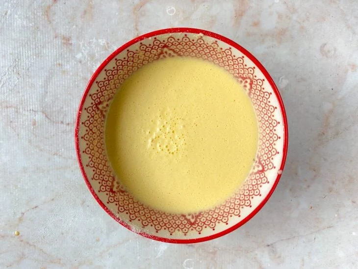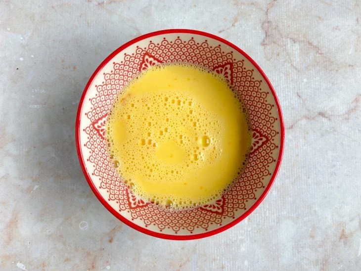 2. Em uma tigela, quebre os ovos um a um para garantir que estão bons. Adicione o leite desnatado e, com a ajuda de uma colher, misture bem para incorporar os ingredientes.