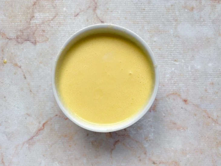 4. Unte o fundo e as laterais de outro recipiente com mel e, cuidadosamente, despeje a mistura do pudim nele.