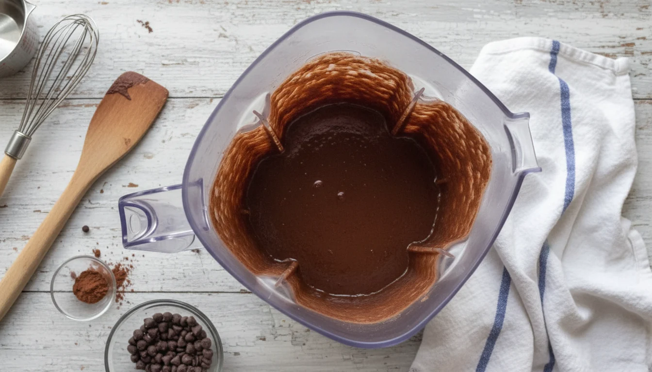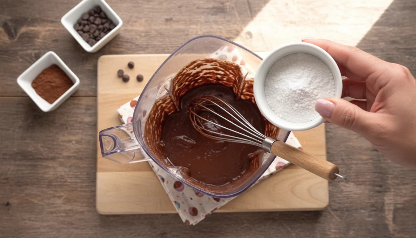 - No liquidificador, adicione os ovos, o leite, o eritritol, o cacau em pó, a manteiga e a farinha. Misture até que a massa fique homogênea e suave;